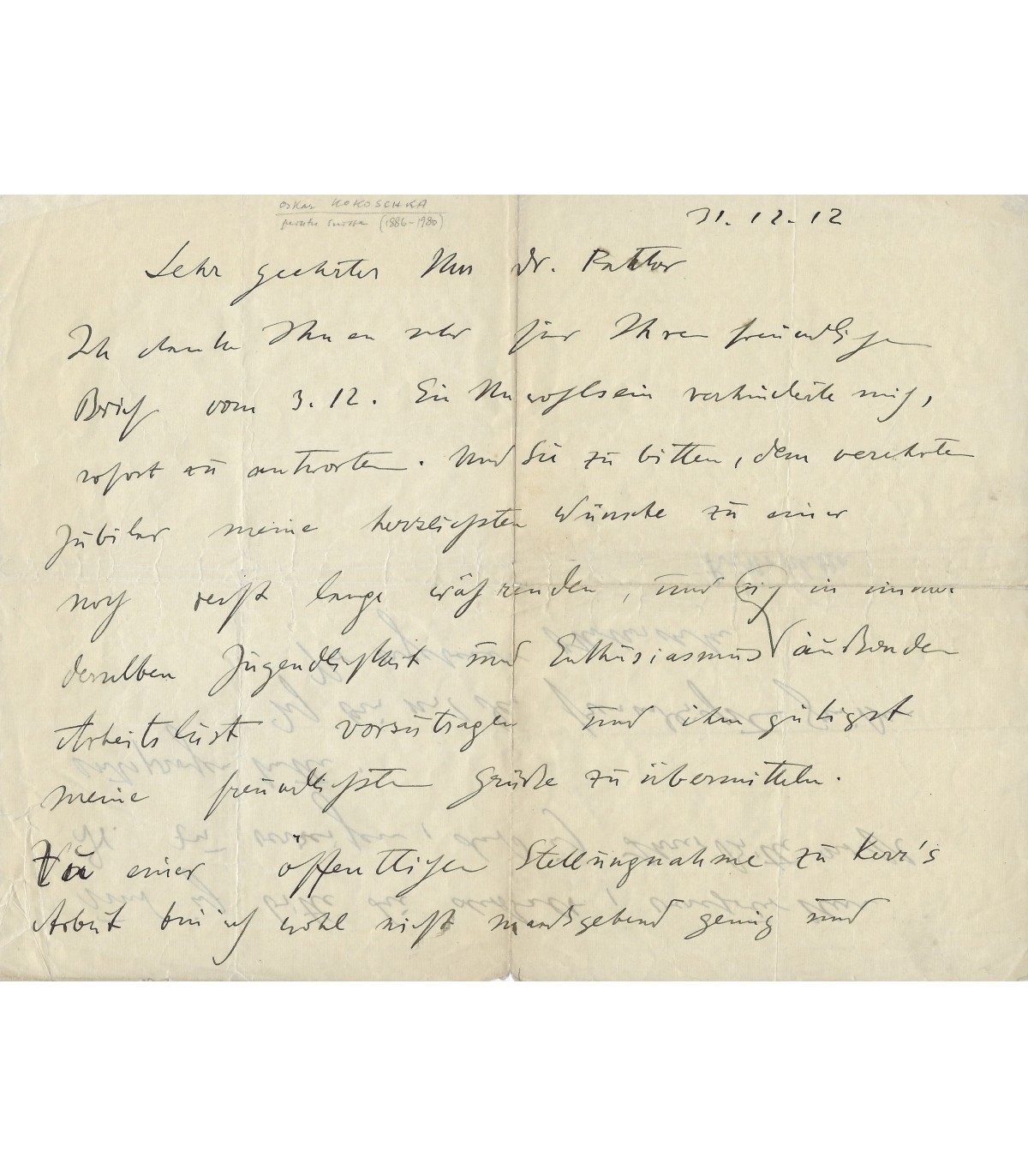 L.A.S. « Kokoschka » au « Dr Rattor », en allemand. S.l., 31 décembre 1912. 1 page 1/2 in-folio oblong.