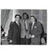 La photographie présente Ray Sugar Robinson entouré de Ray Famechon à sa gauche et d'un homme non identifié à sa droite. Robinson a ses mains posées sur les épaules