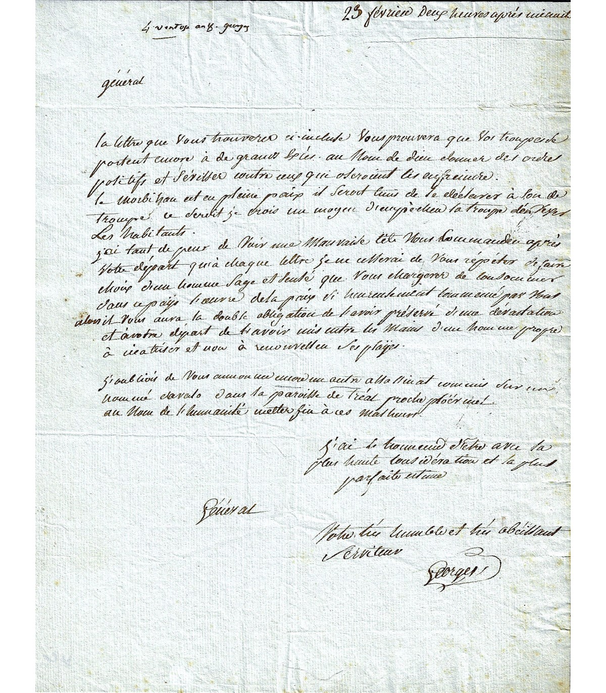 …La lettre que vous trouverez ci-incluse vous prouvera que vos troupes se portent encore à de grands excès. Au Nom de Dieu donner des ordres positifs et sévissez contre ceux qui oseraient les enfreindre. Le Morbihan est en pleine paix il serait tems de le déclarer à son de trompe, ce seroit je crois un moyen d’empêcher la troupe d’en vexer les habitants…