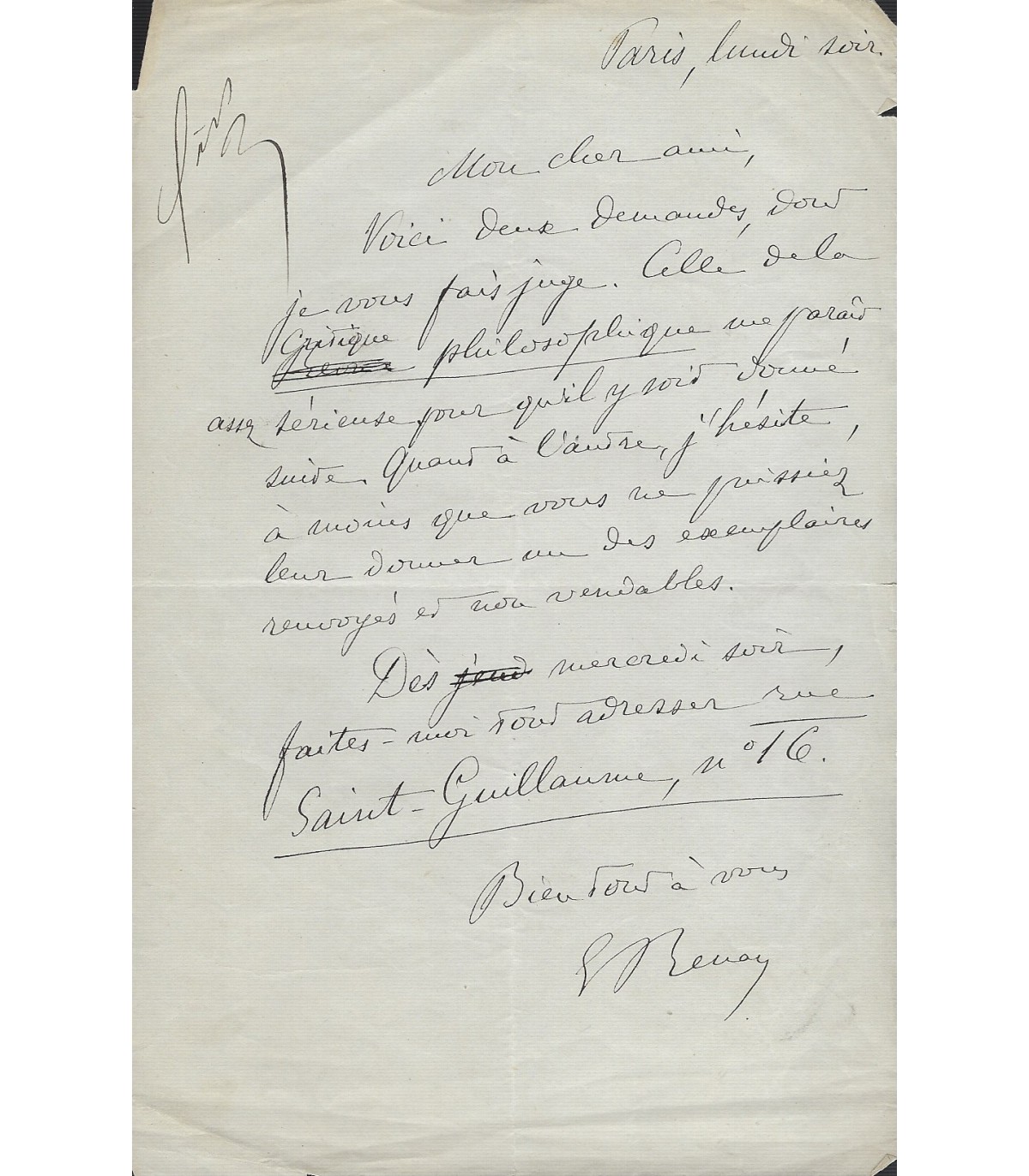 …Voici deux demandes, dont je vous fais juge. Celle de la Critique philosophique me paraît assez sérieuse pour qu’il y soit donné suite. Quant à l’autre, j’hésite, à moins que vous ne puissiez leur donner un des exemplaires renvoyés et non vendables… Le tout devra lui être adressé rue Saint-Guillaume, n° 16…
