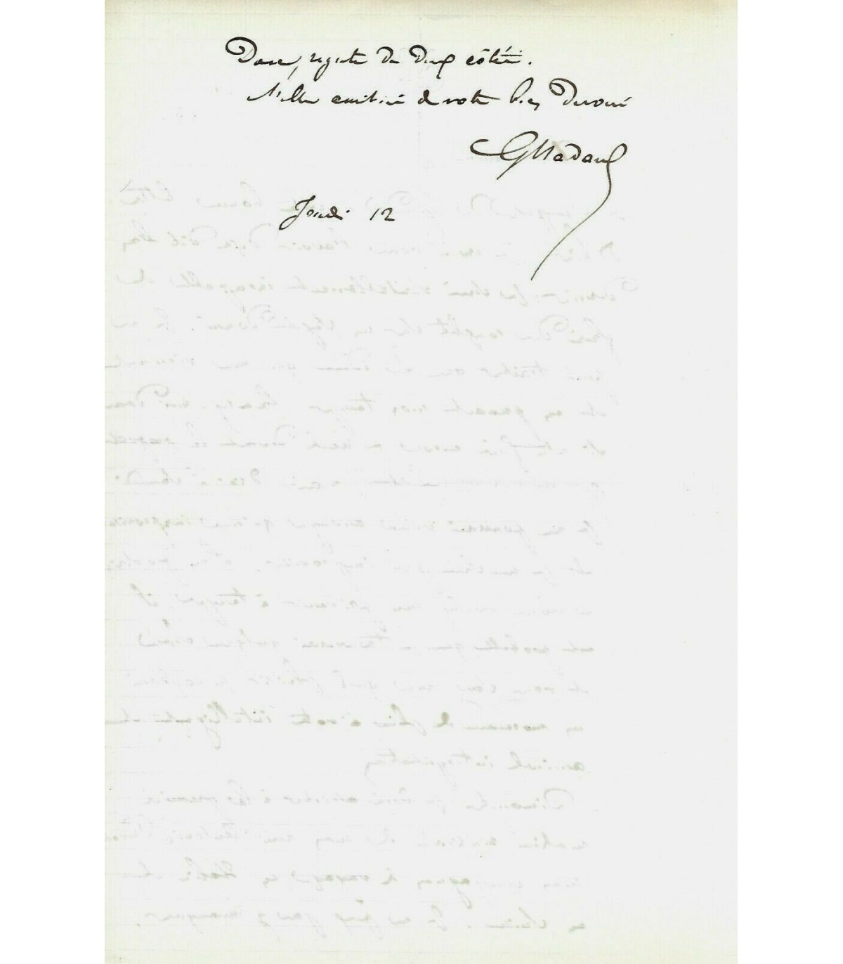 S.l., jeudi 12, s.d. 1 p. 1/4 in-8.
